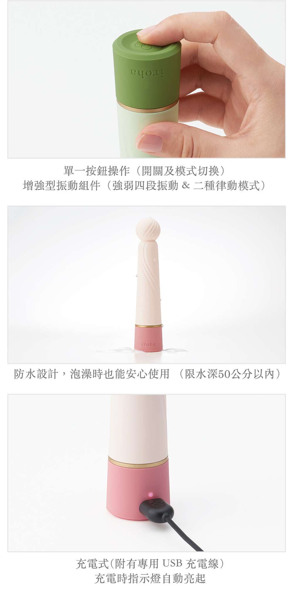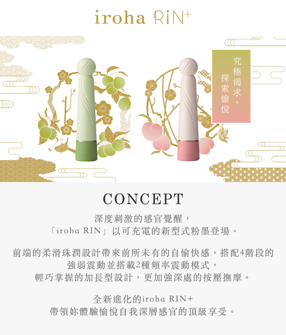 輕觸、撫摩、搔撓、柔捏、深入......感受因人而異,喜好妳我不同。「iroha RIN+」要陪妳追求與眾不同的專屬愉悅,讓妳在「深入淺出」的至福感受之間、自在遊走。