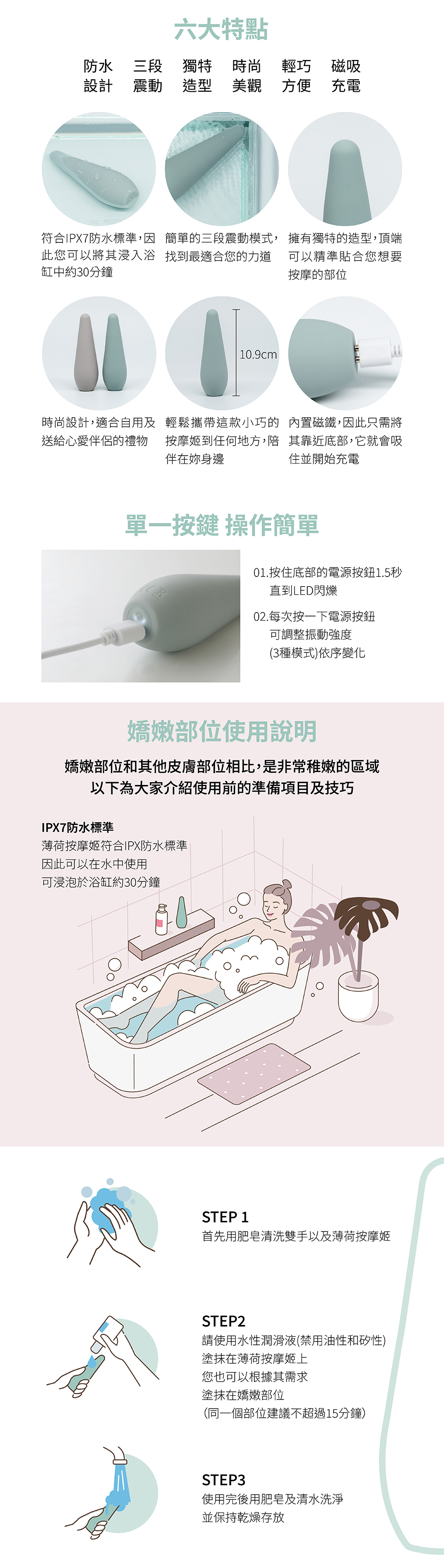 使用前,請先保持雙手與按摩棒的潔淨。輕輕觸摸、調整至適合的模式,探索自身的舒適節奏。為獲得最佳體驗,可搭配水性潤滑劑,增加柔滑觸感。(請勿使用油性即矽性潤滑液,會損壞玩具表面)